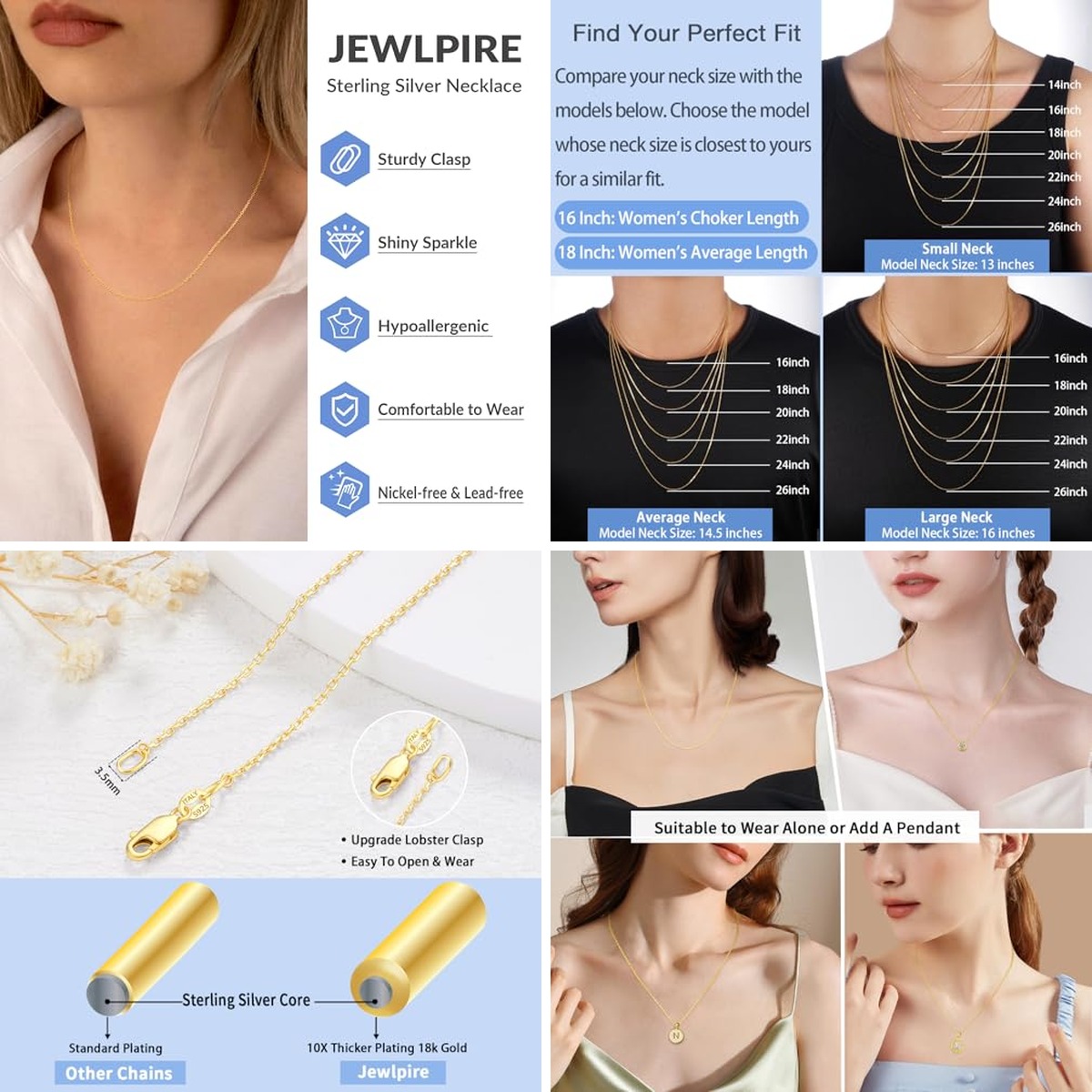 Product | Jewlpire 18K Gold Plated Chain Necklace for Women, 1.2mm Cable Chain 18K Gold Plated Chain for Women Thin & Dainty & Sturdy Women’s Chain Necklaces 18 Inch Jewlpire | Jewlpire 925 Sterling Silver Chain for Women Girls 0.8mm Box Chain Lobster Claw Clasp – Italian Necklace Chain – Super Thin & Strong – Friendly Price & Quality 18 Inch Jewlpire | DEARMAY 14K Gold Plated Necklace for Women Dainty Gold Choker Herringbone Necklaces Simple Minimalist Thin Snake Chain Necklace Gold Jewelry Gifts DEARMAY |
