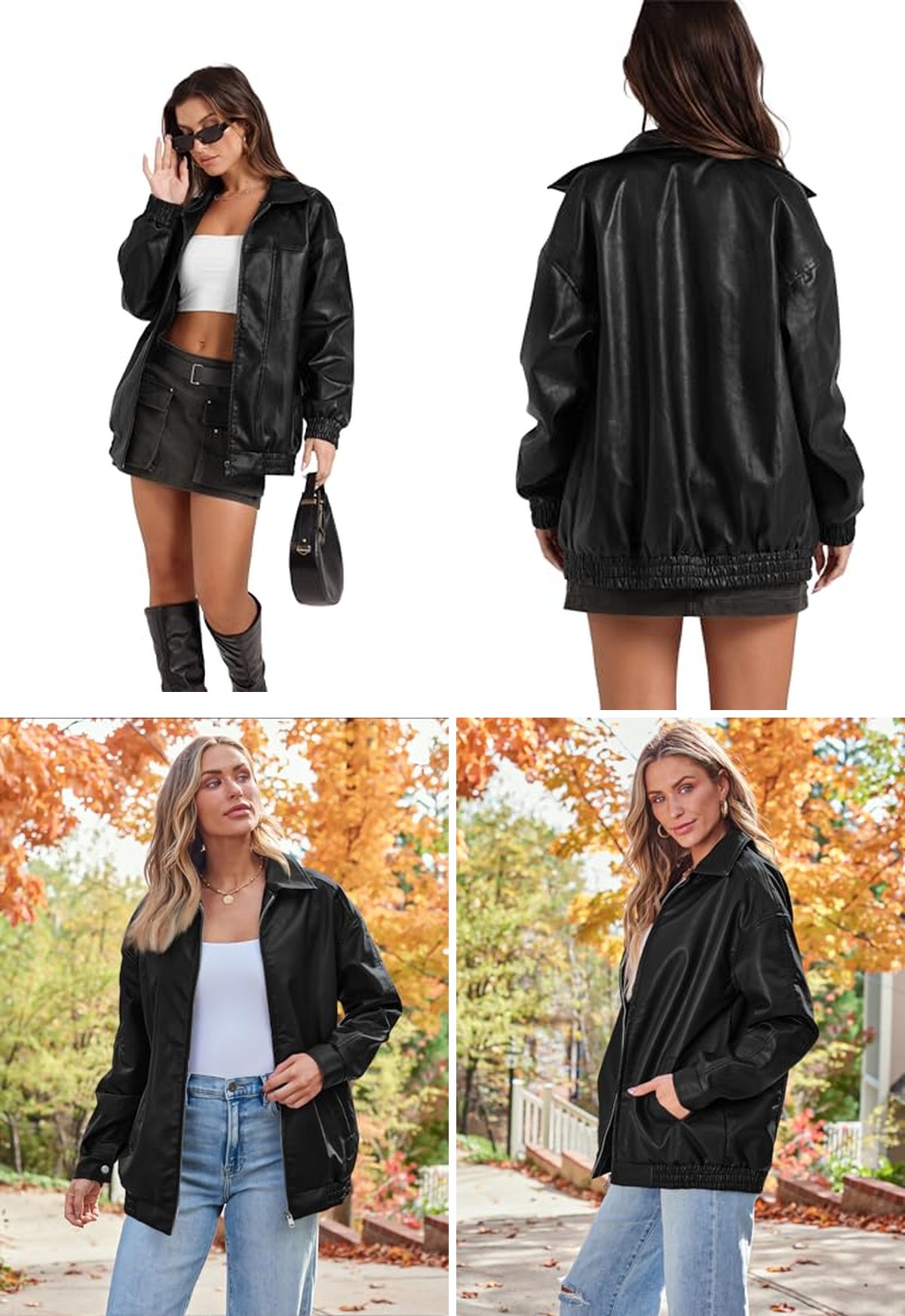 This stylish faux leather bomber jacket offers a chic, oversized silhouette perfect for transitional weather, adding a fashionable outerwear option to outdoor ensembles and providing a contemporary edge to garden gatherings.