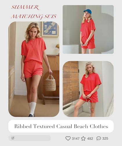 MARZXIN Women's 2 Piece Outfits Summer Tracksuit Ribbed Textured Knit Loose Lounge Shorts Set Short Sleeve Matching Sets Orange L